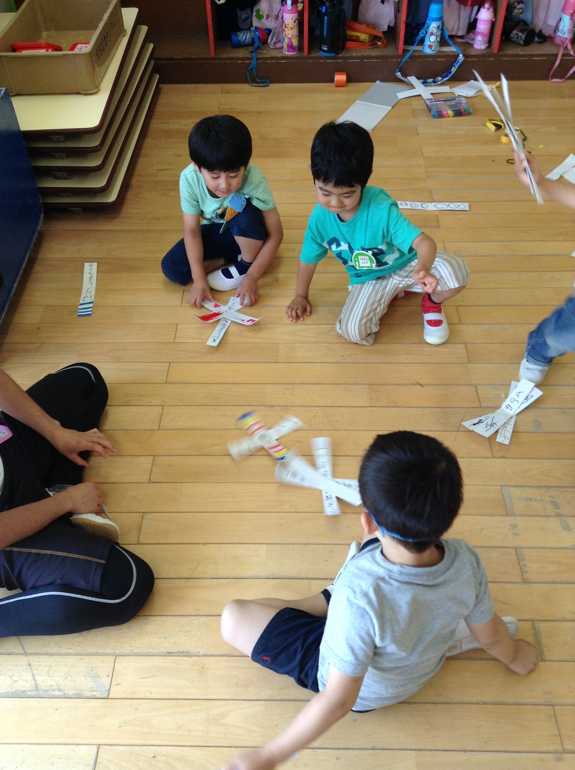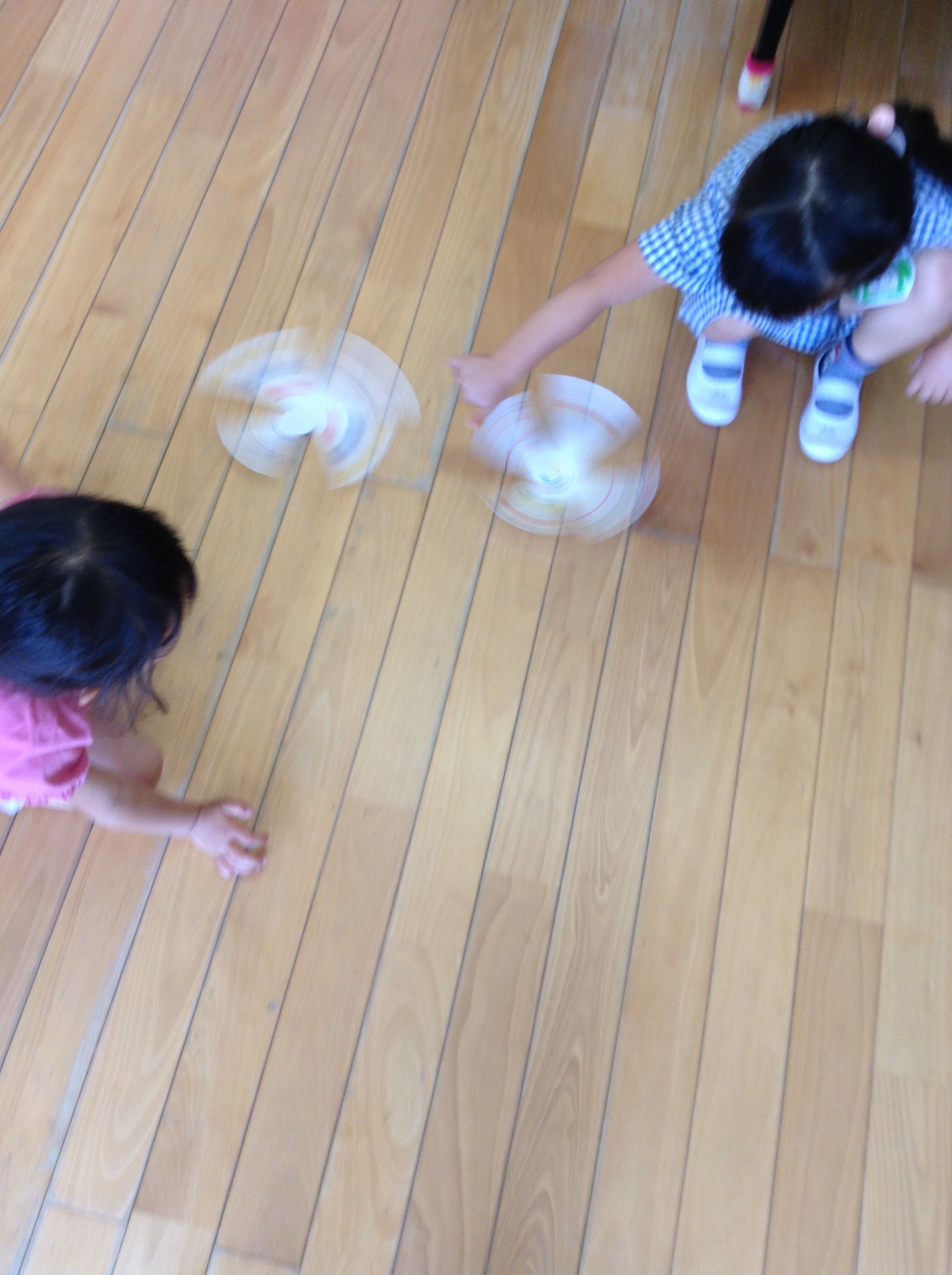 2017/06/01勝負しよう! 年長では、子ども達でこまを作り勝負するのが流行っています。 こうした方が回る!と各自で工夫して改良を重ねています( ´▽`) 時には、よく回るこまを持っている友達に 「どうやって作ったの?教えて〜」と聞きに行く姿も見られます。 仲の良い友達以外にも「勝負しよう!」と声を掛けて あちらこちらで 「あーー負けたあ!」 「いっえーい♪勝ったあ!!」と盛り上がっています!^ ^♡