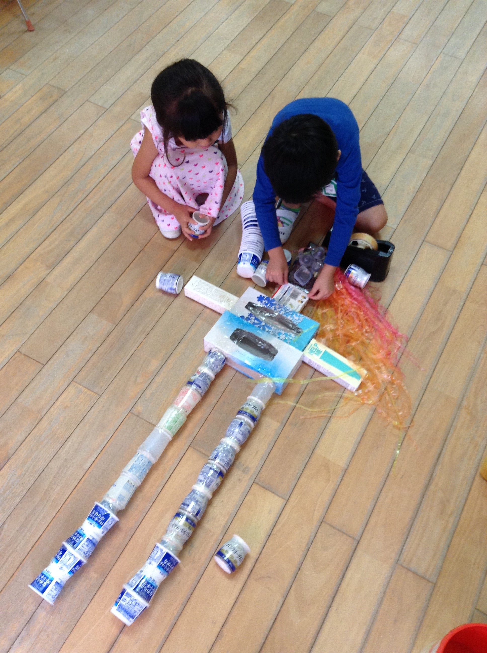 2017/09/21おもしろ作品♪ 1枚目の作品は「かみのけロボット」です。 1人の子が何気なくつけた数本のすずらんテープを、 「かみのけみたいだね!」と他の子が言い、 そこからかみのけをたくさんつけたロボットが 出来上がりました。 かみがあるロボットなんて初めて見たよと、 作りながら 子どもたちが大笑いしていました。 2枚目の作品は、「トイレ」です。 「いつのまにか作ってた!」らしいです(笑) 面白い作り方だなぁと、 感心してしまいました! 子どもたちの素敵な発想を、 これからもたくさん見つけたいです!