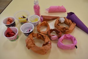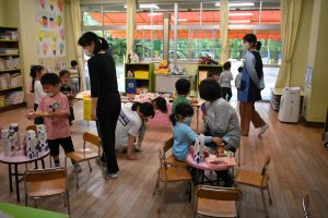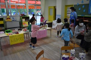 2021/06/10ぱんだレストラン!! ぱんだぐみでは雨の日になると、レストランが開店します!お店のメニューは、ドーナツ、クレープ、アイス、オムライスなど種類が豊富なのが自慢のお店です!!色々なクラスの友達がお客さんになって食べに来てくれました!雨で外遊びができなくても、お部屋の中でも楽しそうに遊ぶ子どもたちです(^O^)